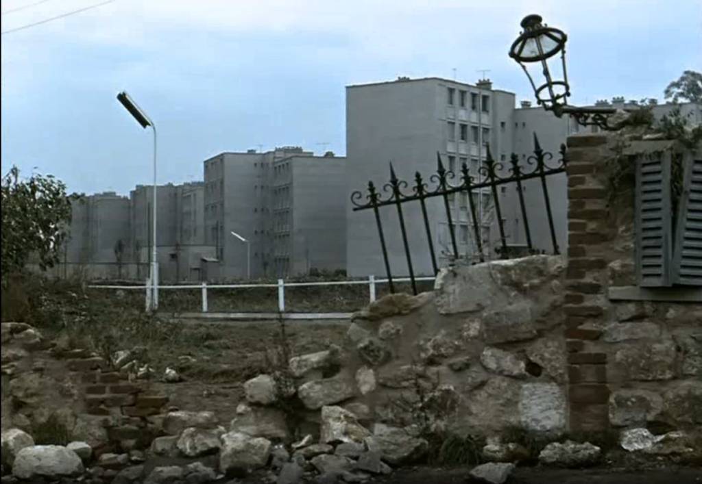 Volviendo a los dos mundos opuestos retratados en la película, un análisis detallado de los símbolos y decorados revela mucho sobre la crítica a la modernidad que expone Mon Oncle tirando de sátira. En el universo de los Arpel, su villa se encuentra totalmente aislada del barrio, siendo su única conexión con éste una puerta metálica que se abre de manera remota. El jardín tiene una complejidad en el diseño que raya en lo absurdo y apenas deja espacio para el disfrute de la vida al aire libre, estando estrictamente marcados los caminos por los que discurrir. Hay un pequeño estanque artificial coronado por una sardina metálica que cumple una función decorativa como surtidor de agua cuando hay visitas (cuidar las apariencias y el qué dirán). El medio de transporte de la familia es el coche, y éste tiene en la parte superior del parachoques un avión, símbolo de exclusividad y futuro. La limpieza y un cuidado del aspecto externo reinan, por supuesto, todas las facetas de la vida. El señor Arpel es dueño de una fábrica de plástico, emblema también de industria y modernidad. Igual que en los retratos de Julius Shulman para los editoriales de Vogue y Vanity Fair, la señora Arpel va vestida de punta en blanco y con tacones para estar dentro de su propia casa (igual que hacemos nosotras para estar bien a gusto después de un día intenso en la oficina). El mobiliario es metálico o de plástico, y hasta se oye un quejido por parte de la vecina soltera al sentarse en el sofá en una de las escenas como muestra de la falta de confort del mismo. La cocina, totalmente blanca y llena de cachivaches que pitan sin cesar, recuerda más a una sala de operaciones de la NASA que a un espacio en el que preparar deliciosas comidas. Las conversaciones para socializar se limitan a los negocios o a hablar sobre posesiones materiales, creándose silencios incómodos. Fuera de la villa Arpel, pero aún en su mundo, todos los edificios son grises y las tipografías tanto de la fábrica de plástico del señor Arpel como del colegio de Gerard son idénticas, crítica, quizás, a que todo se produzca a partir de un mismo molde (producción industrial). Uno de los despachos de la fábrica está coronado por un gran reloj en forma de mapamundi, insignia de globalidad y apertura (son finales de los 50, no lo olvidemos). Casi todos los personajes del entorno Arpel van ataviados con guantes y las calles están ordenadas, bien pintadas, limpias y sin rastro de vida.